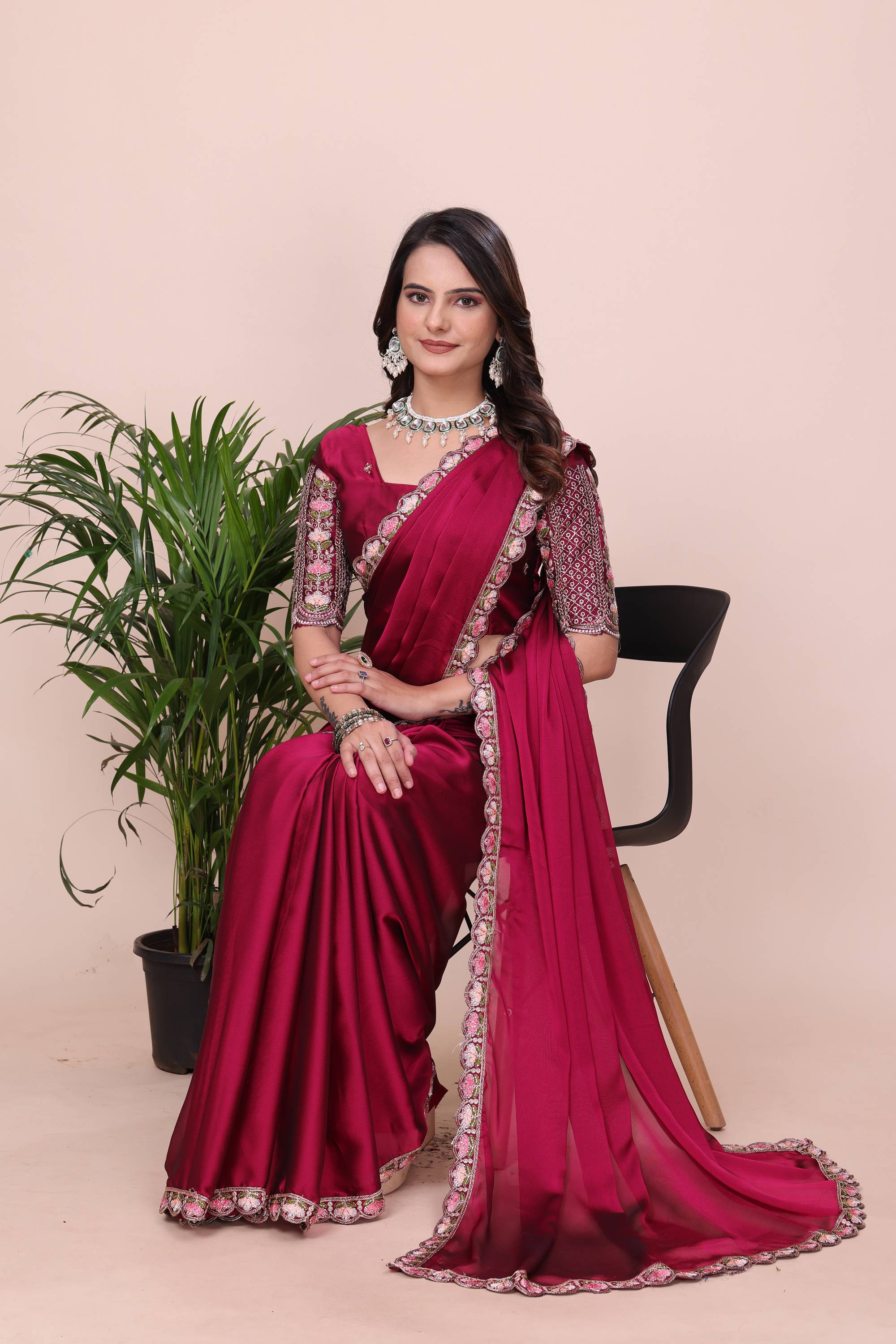 This rich shade pairs beautifully with antique gold or diamond jewelry. Since the blouse has heavy work, opt for a choker necklace and stud earrings to keep the look balanced. Style your hair in a chic low bun or soft waves to show off the blouse embroidery. A pair of strappy gold heels and a metallic clutch will complete this Bollywood-inspired look.
