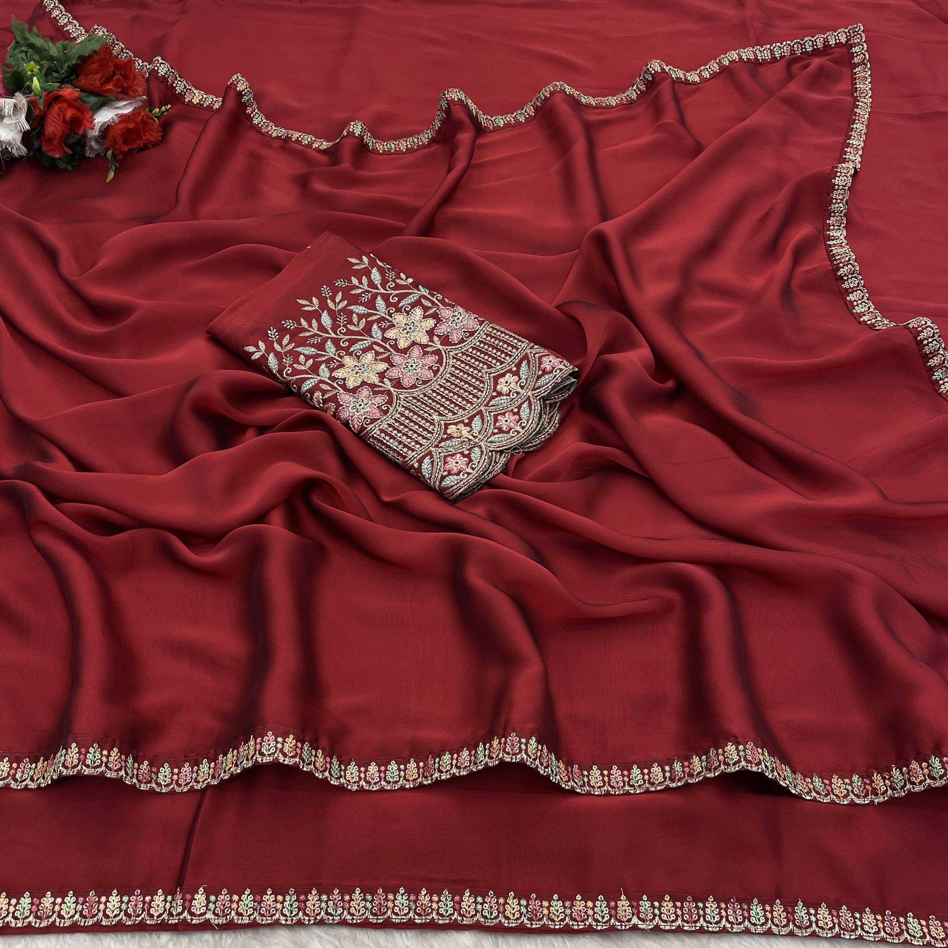 Elevate your ethnic wardrobe with this exquisite Maroon Saree, designed for the modern woman who loves a touch of traditional luxury. Crafted from premium, lightweight Silk fabric, this saree features a fluid drape that flatters every silhouette. The highlight of this piece is the intricate multi-colored floral thread work and gold zari embroidery along the borders, finished with a trendy scalloped edge. Paired with a matching heavy-work blouse piece, this saree is perfect for making a statement at weddings, festivals, and evening parties.
