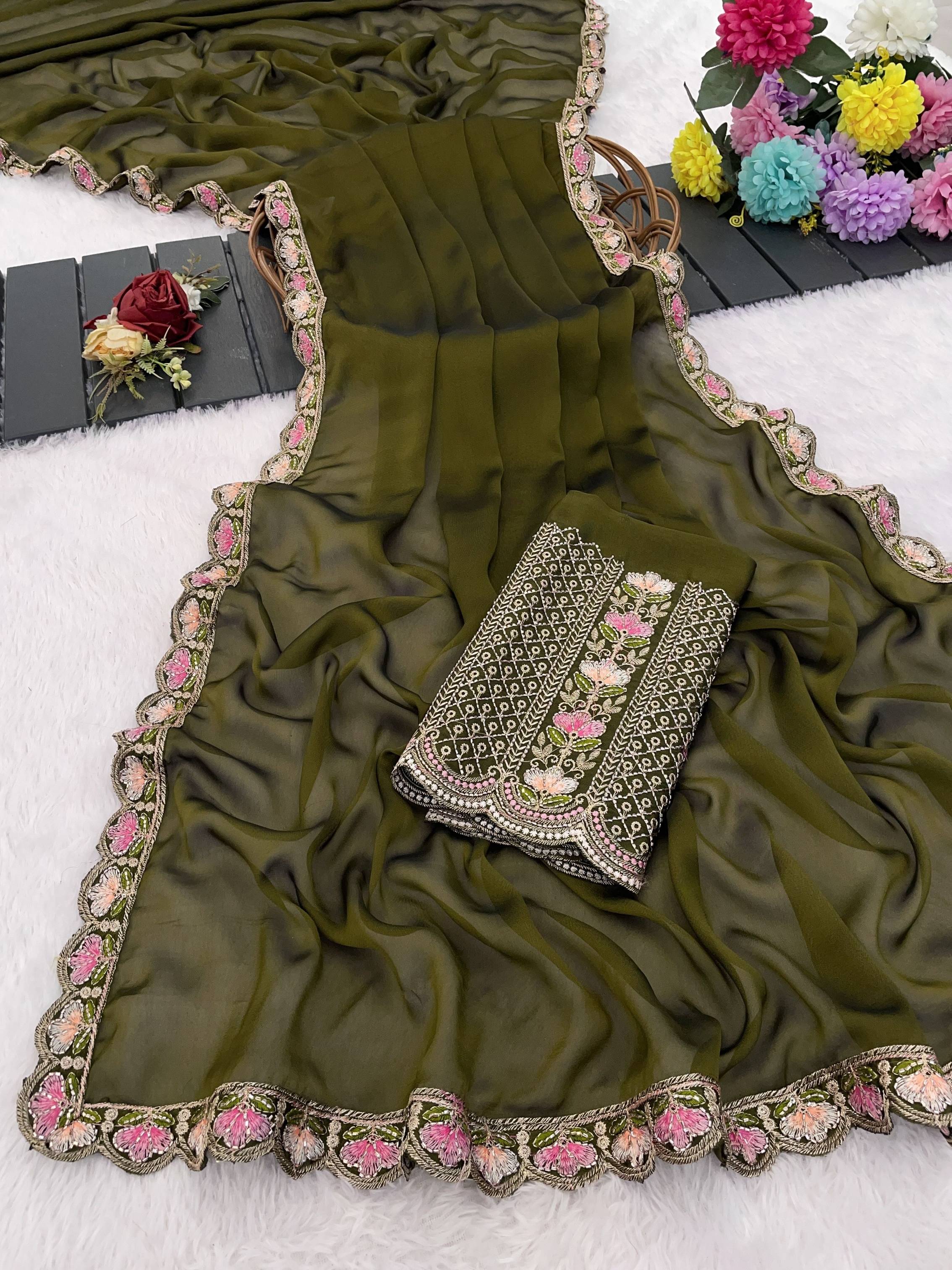 Solid/Plain, Embroidered Bollywood Silk Blend Saree (Dark Green)