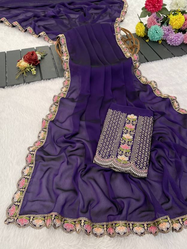 Make a bold style statement with this luxurious Lavender colored saree. Crafted from flowy, premium Silk fabric, this saree offers a graceful drape that is perfect for special occasions. The saree features a trendy scalloped cut-work border adorned with delicate floral embroidery in contrasting pastel pink and peach threads. It is paired with a stunning, heavy-work unstitched blouse piece that features a rich geometric lattice (jali) pattern and a central floral vine, ensuring you look elegant from every angle. Ideal for weddings, receptions, and festive celebrations.