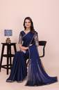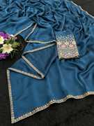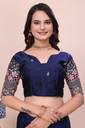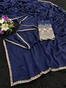 Elevate your ethnic wardrobe with this exquisite Navy Blue Saree, designed for the modern woman who loves a touch of traditional luxury. Crafted from premium, lightweight Silk fabric, this saree features a fluid drape that flatters every silhouette. The highlight of this piece is the intricate multi-colored floral thread work and gold zari embroidery along the borders, finished with a trendy scalloped edge. Paired with a matching heavy-work blouse piece, this saree is perfect for making a statement at weddings, festivals, and evening parties.
