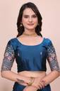 Elevate your ethnic wardrobe with this exquisite Morpeach Blue Saree, designed for the modern woman who loves a touch of traditional luxury. Crafted from premium, lightweight Silk fabric, this saree features a fluid drape that flatters every silhouette. The highlight of this piece is the intricate multi-colored floral thread work and gold zari embroidery along the borders, finished with a trendy scalloped edge. Paired with a matching heavy-work blouse piece, this saree is perfect for making a statement at weddings, festivals, and evening parties.