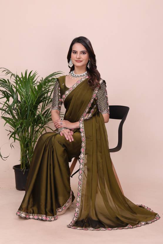 Make a bold style statement with this luxurious Mehendi colored saree. Crafted from flowy, premium Silk fabric, this saree offers a graceful drape that is perfect for special occasions. The saree features a trendy scalloped cut-work border adorned with delicate floral embroidery in contrasting pastel pink and peach threads. It is paired with a stunning, heavy-work unstitched blouse piece that features a rich geometric lattice (jali) pattern and a central floral vine, ensuring you look elegant from every angle. Ideal for weddings, receptions, and festive celebrations.