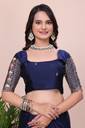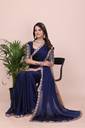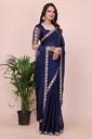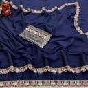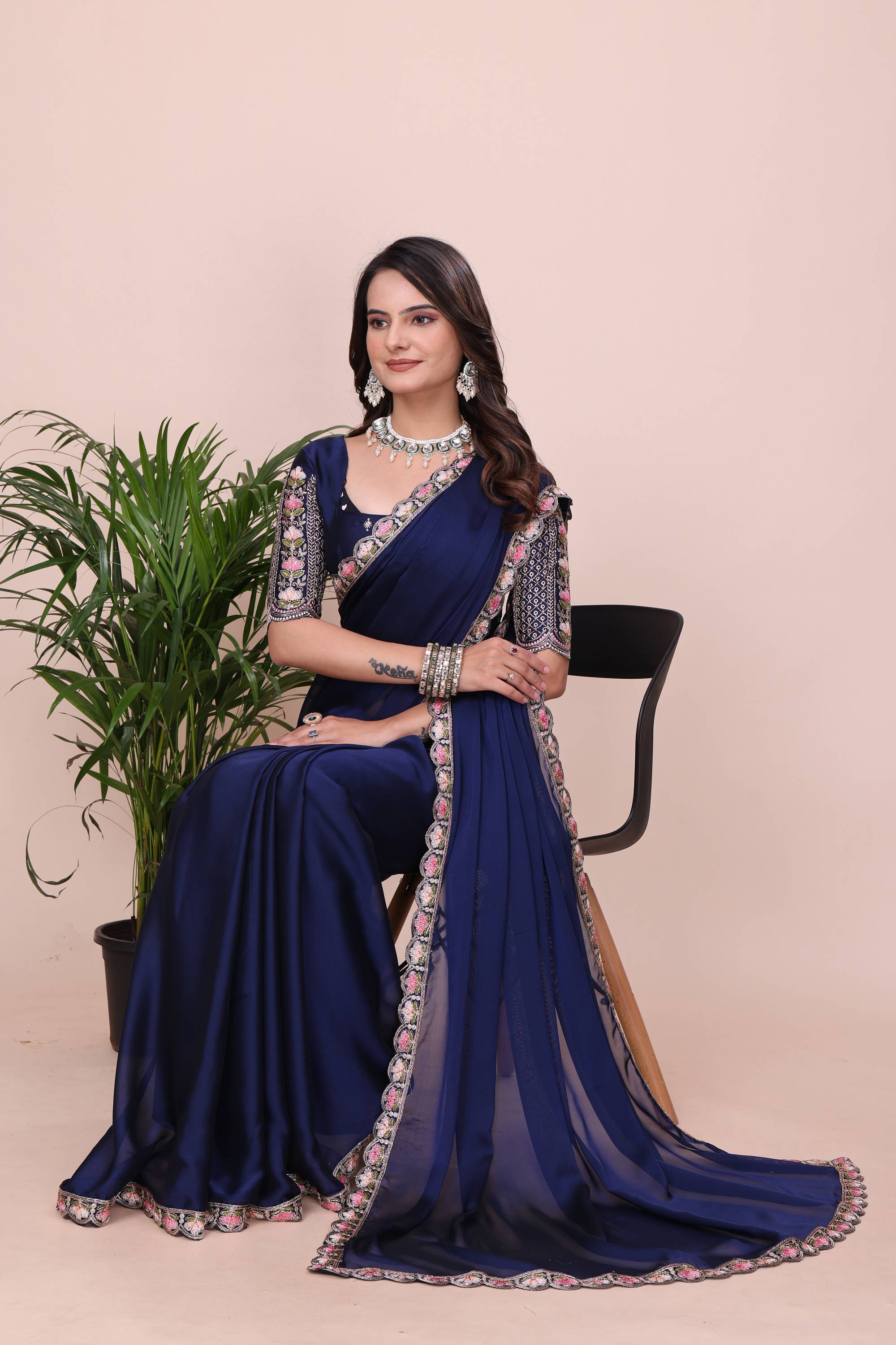 Make a bold style statement with this luxurious Navy Blue colored saree. Crafted from flowy, premium Silk fabric, this saree offers a graceful drape that is perfect for special occasions. The saree features a trendy scalloped cut-work border adorned with delicate floral embroidery in contrasting pastel pink and peach threads. It is paired with a stunning, heavy-work unstitched blouse piece that features a rich geometric lattice (jali) pattern and a central floral vine, ensuring you look elegant from every angle. Ideal for weddings, receptions, and festive celebrations.