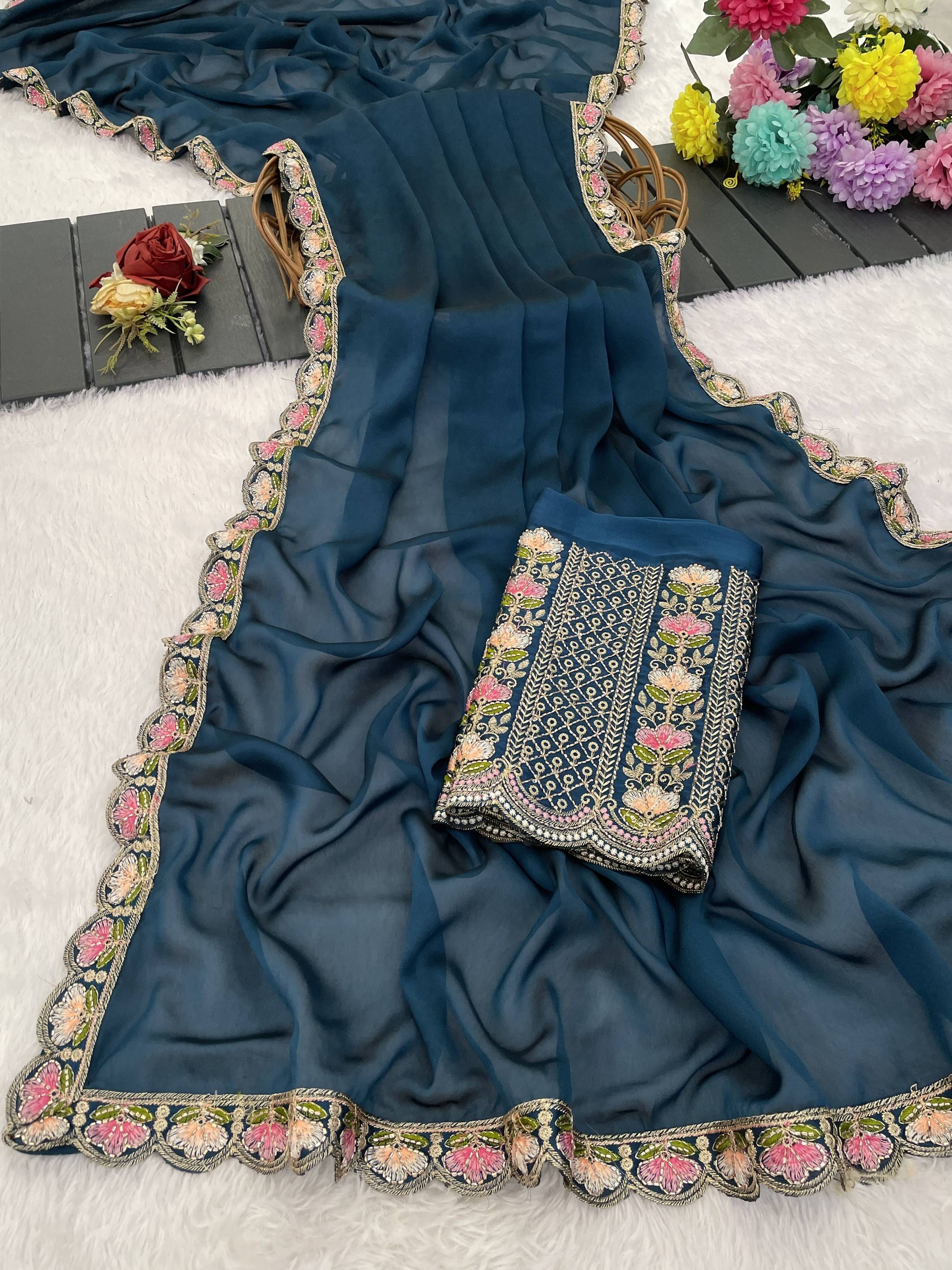 Solid/Plain, Embroidered Bollywood Silk Blend Saree (Blue)