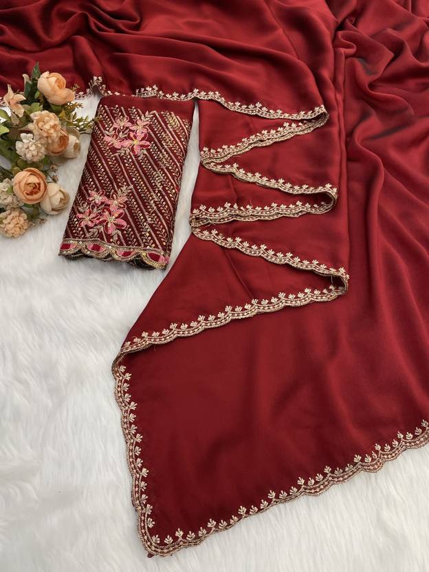 The saree is edged with a trendy scalloped cut-work border, detailed with fine golden zari and sequin work. The highlight of this ensemble is the heavy designer blouse piece, which features striking diagonal embroidery and a vibrant blue floral motif, offering a glamorous contrast. Lightweight and comfortable, this saree is easy to carry for long events while ensuring you look effortlessly chic.