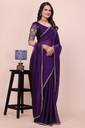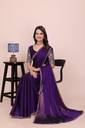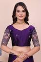 For a regal look, pair this saree with gold jhumkas and a sleek low bun adorned with flowers. Opt for a contrast clutch or a gold potli bag to complement the zari work. Minimal makeup with a bold lip color will perfectly balance the rich purple hue.