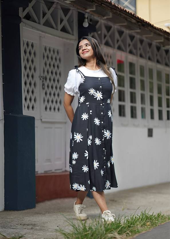VastraaMall Women Two Piece Dress Grey, White Midi/Calf Length Dress