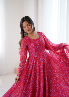 Floral Print Georgette Stitched Anarkali Gown (Pink)