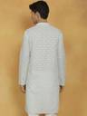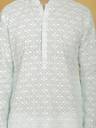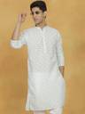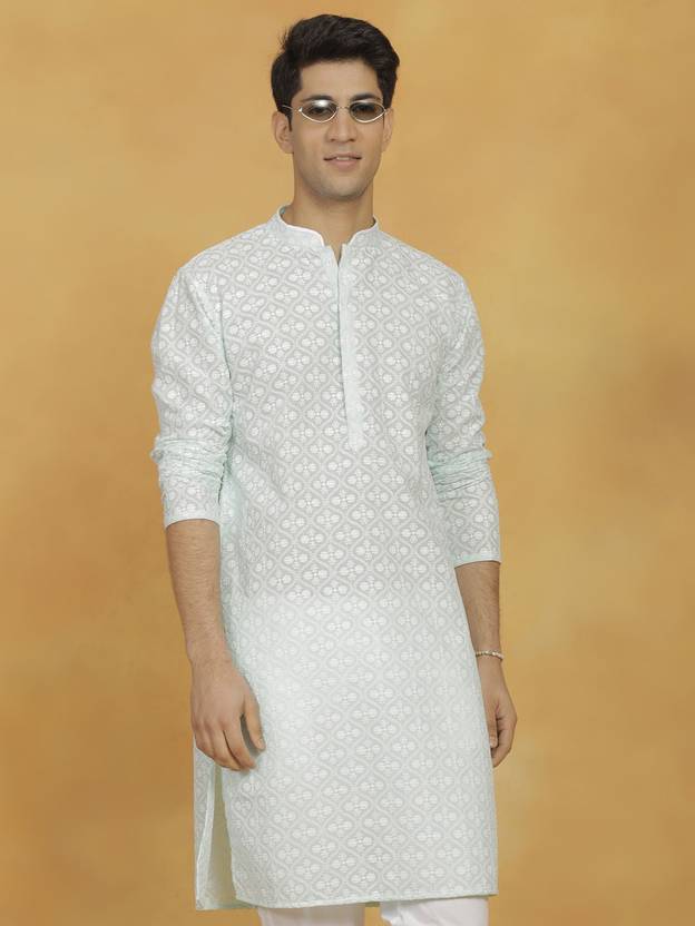 Cotton allover Chikan Embroidery knee length kurta,has a mandrin collar, long sleeves,Button closure, straight hem and side slits.Wear it in parties,traditional functions and festive occasion.