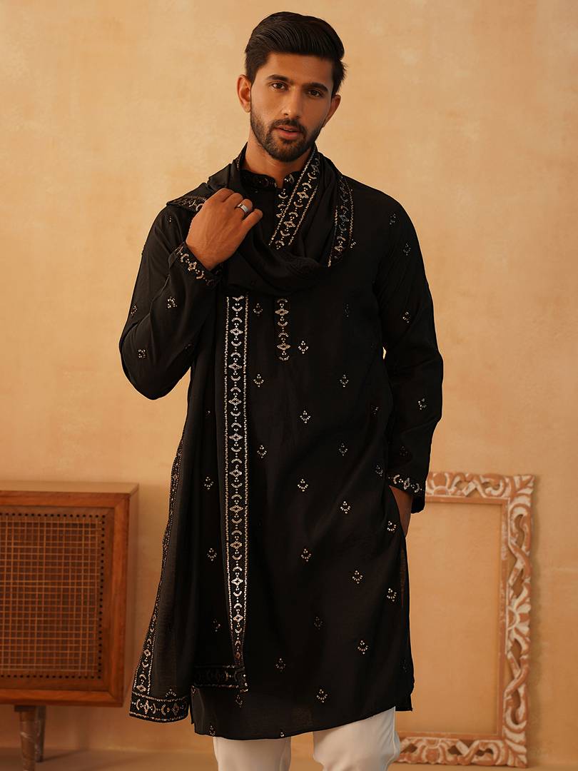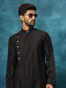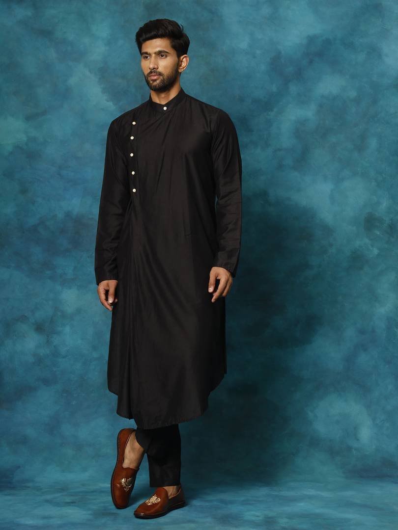Fabric: Viscose Blend | Contents: a Angrakha Design Asymmetrical Pleated Viscose Kurta. We have ornamented the kurta by adding wooden Buttons.Angrakha Design Asymmetrical Pleated Viscose Kurta. We have ornamented the kurta by adding wooden Buttons.Medium length and Regular Fit. Our Kurta fitting is usually slightly relaxed compared to a Regular Shirt's fitting. Select your Kurta size based on your chest dimension. Note: if one has a heavier abdomen compared to chest then he should select one size bigger kurta. Our Churidar Pajamas have drawstrings and a separate pocket attached to it. The pyjama bottom mohri is usually kept narror to bring out the best possible churi look. Although popularly known as Kurta Pyjama but this ethnic wear for men can be suitably used as pathani suit for men stylish, jubba for men, panjabi for men or khan dress for men stylish. Most material used for kurta under 300 tensil count only. These are good alternative to a Indo western or a sherwani. Check out for kurta for mens new looks, kurta for mens wedding, punjabi kurta for men.All our kurtas have five inches loosening over the body measurement. So if your chest round measurement is 38 inches then you should go for a 38 (Medium) size Kurta which will have a garment ready chest measurement of 43 inches. We offer six sizes - Small = 36 (Chest - 41), Medium = 38 (Chest - 43), Large = 40 (Chest - 45), X- Large = 42 (Chest - 47), XX - Large = 44 (Chest - 49) and XXX - Large = 46 (Chest - 51). Suitable for: Party, Weddings, Regular Wear, Celebrations, Occasions, Festivals, Lohri, Pongal, Makar Sakranti, Baisakhi, Holi, Eid, Raksha Bandhan, Dussehra, Diwali, Navratri, Pooja, Christmas, Onam, Ganesh Chaturthi, Janmasthmi and Gifts for Mens.Wash Care Instructions: Dry Clean preferably or cold light wash.Disclaimer: We have made a consistent effort to make the colors and finishes similar to the image of the products you see on screen. However, the actual product and the images on the website can differ! Customer's discretion is advised.