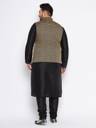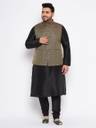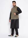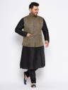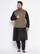 Fabric: Silk Blend | Contents: A Banarasi Brocade Woven Jaquard Modi/Nehru Jacket atop a Silk with slight Cotton mix Soft Comfortable Feel Solid Kurta and Churidar Pyjama Set.Banarasi Brocade Woven Jaquard Modi/Nehru Jacket atop a Silk with slight Cotton mix Soft Comfortable Feel Solid Kurta and Churidar Pyjama Set.All our kurtas have five inches loosening over the body measurement. So if your chest round measurement is 46 inches then you should go for a 46 (3XL) size Kurta which will have a garment ready chest measurement of 51 inches. We offer six sizes - XXL= 44 (Chest - 49), 3XL= 46 (Chest - 51), 4XL= 48 (Chest - 54), 5XL = 50 (Chest - 56), 6XL = 52 (Chest - 58) and 7XL = 54 (Chest - 60). Disclaimer: We have made a consistent effort to make the colors and finishes similar to the image of the products you see on screen. However, the actual product and the images on the website can differ! Customer's discretion is advised.Suitable for: Party, Weddings, Regular Wear, Celebrations, Occasions, Festivals, Lohri, Pongal, Makar Sakranti, Baisakhi, Holi, Eid, Raksha Bandhan, Dussehra, Diwali, Navratri, Pooja, Christmas, Onam, Ganesh Chaturthi, Janmasthmi and Gifts for Mens.Wash Care Instructions: Dry Clean preferably or cold light wash.