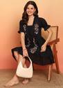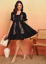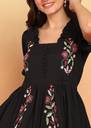 Make every step stylish with this beautifully crafted black cotton dress by Vbuyz. Designed with a flattering flared silhouette, this dress blends classic elegance with playful charm. The soft cotton fabric ensures comfort, while delicate embroidery, potli accents, and ruffled pleats bring texture and movement to your look. The balloon sleeves and square neckline add a fashionable edge, making this dress perfect for both everyday chic and special occasions.
