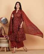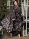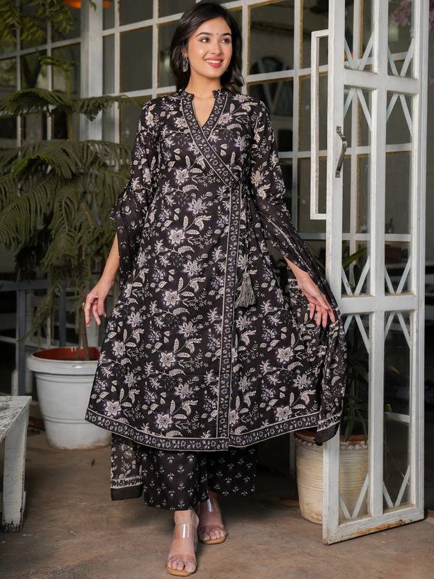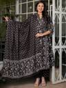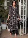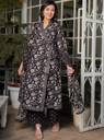 Transform your wardrobe with the Angarakha cotton black suit set. The kurta features an floral print and two side pocket.The suit is tailored with a Chinese Neck elegant touch. The three quarter sleeves enhance the overall look of the suit. This suit set is not complete without its accompanying block printed plazzo and printed dupatta. Invest in this suit set and embrace the traditional beauty with a modern twist.