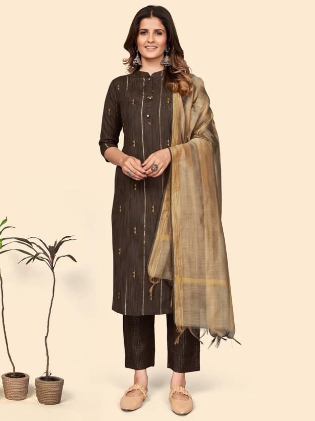 Vbuyz Women'S Printed Straight Cotton Blend Brown Stitched Kurta Pant With Dupatta Has A Mandarin/Chinese Neck, Regular Sleeves, Printed, Straight Hem, Side Slit. It Will Keep You Comfortable For A Party Wear Look. Pair It With High Heels And Look Effortlessly Chic And Fashionable.