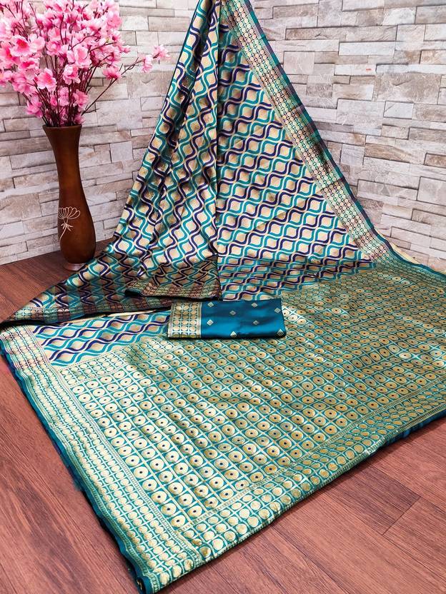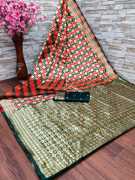 Dhruti Creation offers Litchi Silk Banarasi & Kanjivaram Saree. Saree have beautiful Jacquard Work with alluring pattern at enitre saree it creats look like Golden Zari border saree. Material of this saree and Blouse is Lichi Silk which is softer and skin friendly. These new traditional designer saree for women can be used as party wear saree, Festival saree, wedding saree & Casual Wear Saree also. Product colour may slightly vary due to photographic lighting sources or your monitor settings.