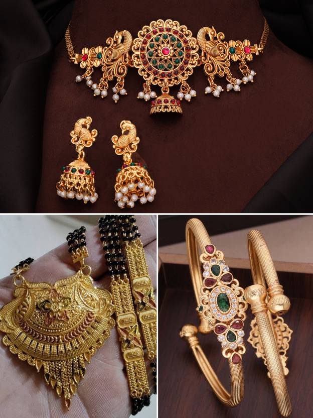 This exquisite jewelry combo brings together timeless tradition and modern elegance, making it the perfect choice for any special occasion. The beautifully crafted mangalsutra adds a touch of cultural grace, while the elegant necklace set with matching earrings enhances your neckline with a sophisticated charm. Paired with a finely designed set of bangles, this complete ensemble reflects a perfect balance of style and tradition. Each piece is carefully plated with a rich golden finish for a radiant shine and durability, making it suitable for weddings, festive celebrations, or party wear. With its versatile design, this jewelry set ensures that you always have the right accessory to complement your ethnic or contemporary outfits, creating a graceful and fashionable look effortlessly.