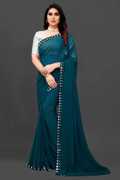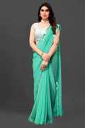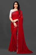 This is a Faux Georgette Plastic Mirror work Party Wear Saree.This Saree comes with an attached Art Silk blouse fabric which can be customised from 32" to 42".