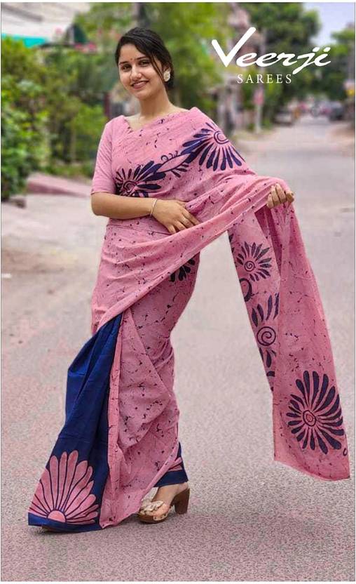#pink-saree #floral-pattern #batik-print #navy-blue-border #cotton-blend #casual-wear #semi-formal #lightweight-fabric #short-sleeve #traditional-style