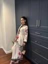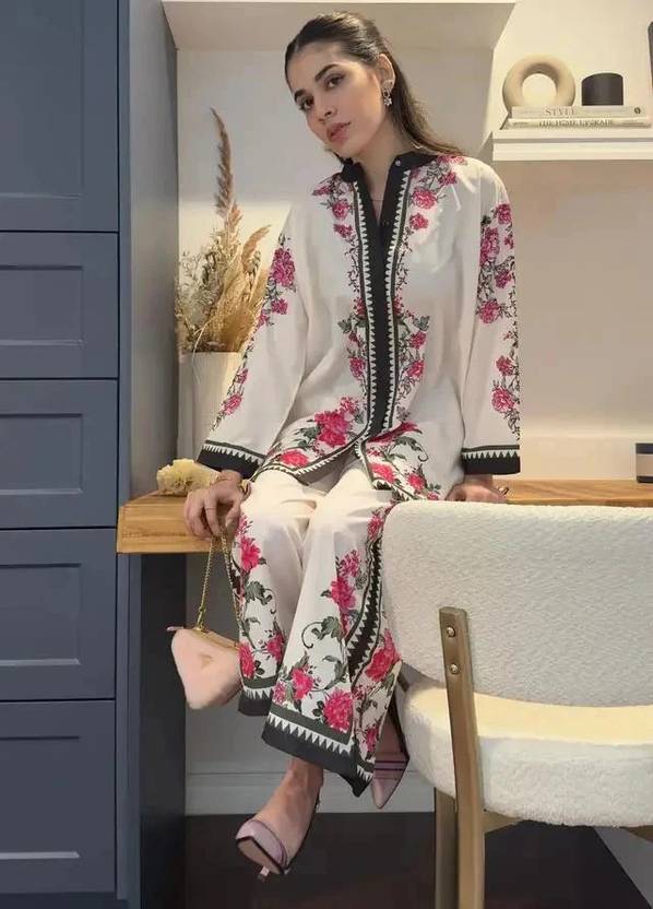 Enhance your ethnic wardrobe with this off-white floral printed co-ord set, designed for modern comfort and timeless elegance. This two-piece outfit features a beautifully printed long kurta paired with matching straight pants. The vibrant pink floral design and bold black zigzag detailing add a trendy contrast to the subtle off-white base.