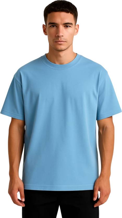 Men Solid Round Neck Pure Cotton Light Blue T-Shirt