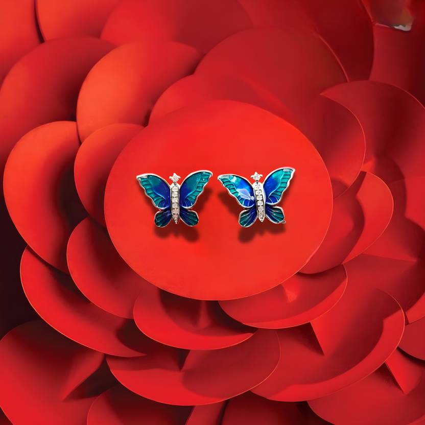 Dazzling butterfly earrings in rich teal and blue tones with a rhinestone-embellished body—perfect for adding a touch of elegance and color.