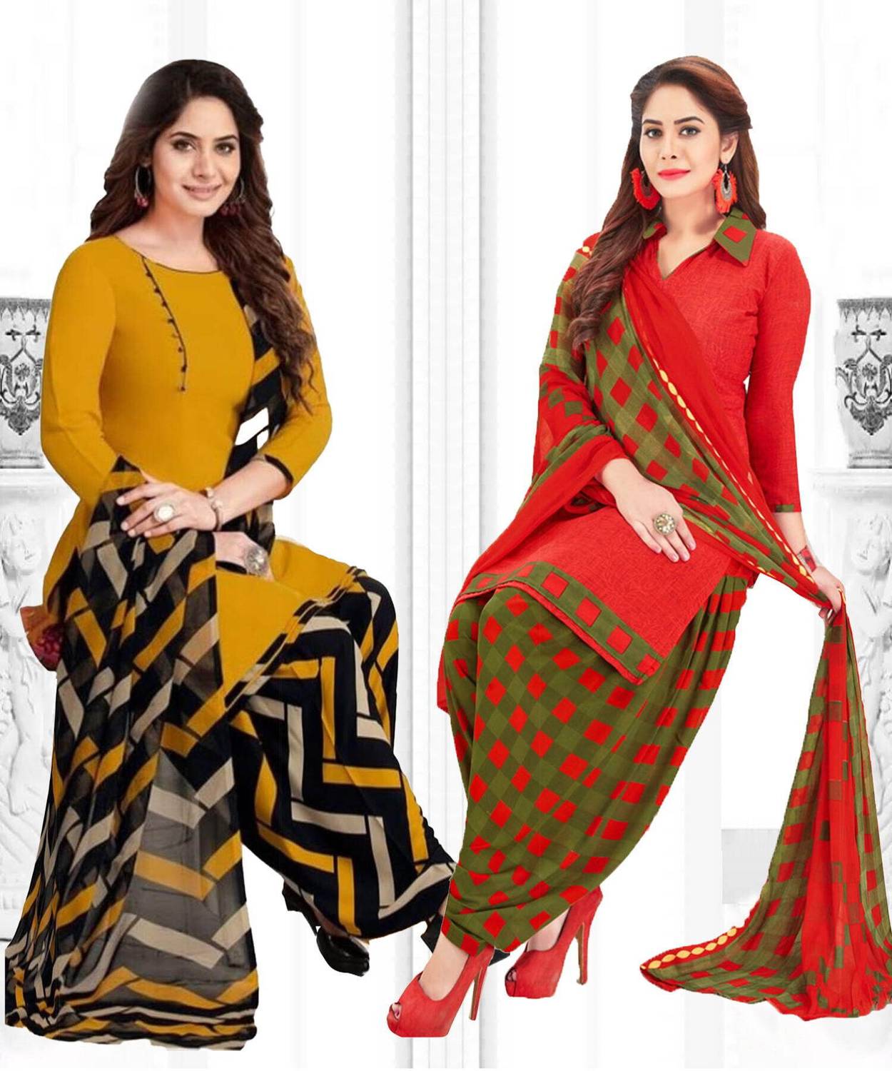 Womens Crepe Printed Unstiched Dress Material. Add style to your Daily Wear Collection with this Printed Dress material Salwar suit. 2 Unstitched Salwar, 2 Unstitched Top, 2 Dupatta.Top & Bottom Fabric : American Crepe, Dupatta Fabric : Martina You can use it for daily wear purpose it will give you immense comfort and fresh styling look.