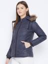 Vero Amore Women's Navy winter wear full sleeve solid parka Jacket. Quilted with high quailty polyfill fiber and has a detachable faux fur hood. Has 3 pocket 1 inside and 2 outside.