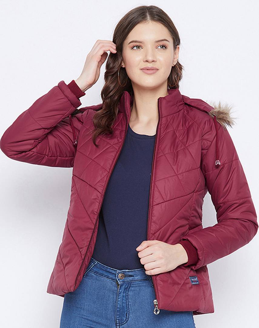 Women's Maroon winter wear full sleeve solid parka Jacket. Quilted with high quailty polyfill fiber and has a detachable faux fur hood. Has 3 pocket 1 inside and 2 outside.