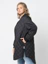 Women's plus size puffer jacket. Designed with 3/4th sleeves, quilted fabric, curved hemline, zipper at bottom seams, front pocket, front placket with snap buttons, and length that falls above knee.