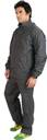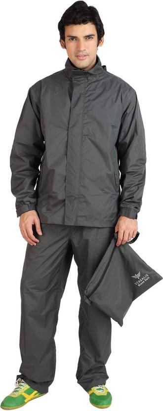 Shirt pant with hood with drawstring closure, superior nylon make with pvc coating on the inner side, water repellent, eco friendly non toxic, inner lining of polyester and net for extra strength and comfort, for extra strength and comfort with flap protection. Two pockets with flap on the front, elastic fasteners at sleeve cuffs.