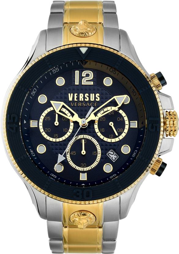 Versus Versace mens collection is bold yet cool with a rebellious tone that is distinctively Versus Versace. These watches are for fashionable gents always living for the moment and remembering that time well spent is never wasted. Chronograph function, 49mm Case, Blue Dial and Two tone Silver&Gold Bracelet.