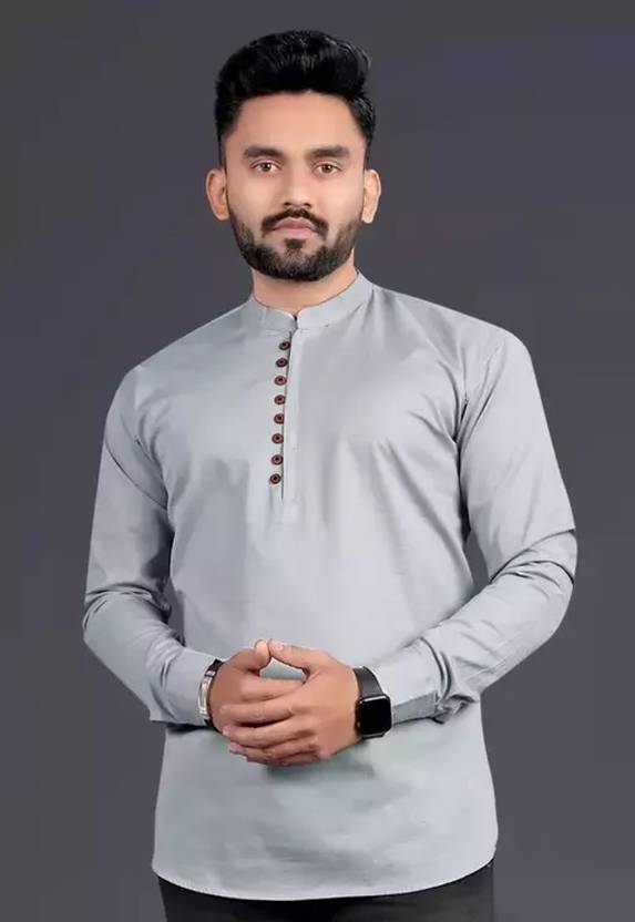 Men Solid Cotton Blend Anarkali Kurta (Silver)