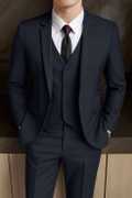 1) Classic black 3-piece suit for men, ideal for formal events or professional wear, 2) Versatile and easy to pair with various shirts and accessories, 3) Crafted from high-quality fabric for comfort and durability, 4) Perfect for weddings, business meetings, and special occasions