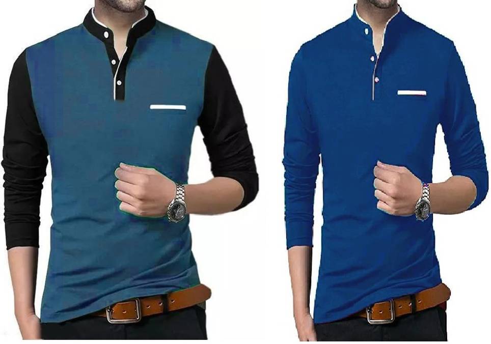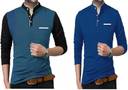 Men Solid Mandarin Collar Cotton Blend Blue T-Shirt