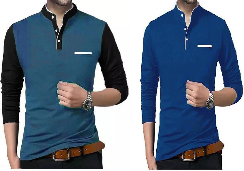 vescor Solid Men Mandarin Collar Blue T-Shirt