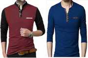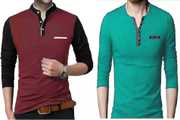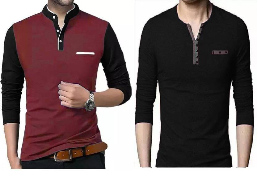 Pack of 2 Men Colorblock, Solid Mandarin Collar Cotton Blend Maroon, Black T-Shirt