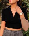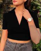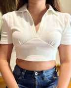 Fabric :Rib Knit, Pattern: Solid Sleeve: Short Slevees, Neck: V Neck Fit Type: Slim Fit, Closure: Pull On Details: Crop Top, Ribbed, Solid, Puff Sleeves, Collared STYLE: Trendy ribbed crop top featuring a sophisticated V-neck collar design and short sleeves for a chic, contemporary look FIT: Slim-fit silhouette with a cropped length that sits above the waist, perfect for creating fashionable layered outfits