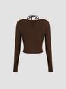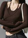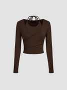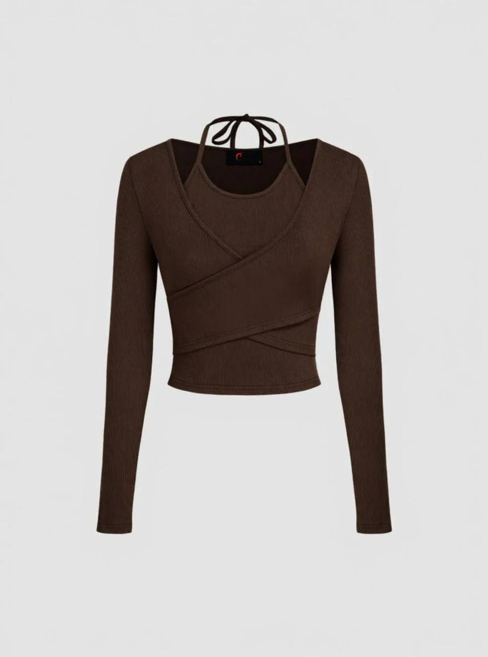 Istyle Can Women’s Halter Neckline Knotted Cross-Wrap Crop Top | Long Sleeve Fake Two-Piece Rib Knit Slim Fit Top | Solid White, Black, Brown | Y2K / Acubi Style