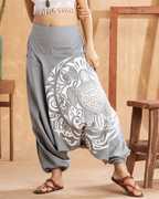 Free Size : Waist : 26"-36" (Comes with Half Elasticated waist, Anyone in the Waist size range would fit in) Height : 40" (adjustable with a Cuff at the bottom) Elevate your style and truly be yourself in the beautiful Harem pants pants. These harem pants will truly make you stand apart from the rest and embody your effortless and relaxed lifestyle. The pants are made of an incredibly soft long staple 100% cotton fibres and are adjustable with a cuff at the bottom of the pant. The perfect choice for being yourself and truly you.