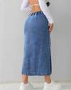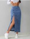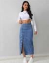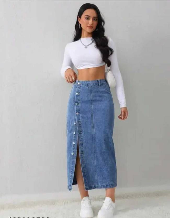 Trendy blue denim midi skirt for women with high waist and button-front design. Stylish and comfortable jean skirt, perfect for casual wear, street style, and everyday fashion. • denim midi skirt women • blue jean skirt long • high waist denim skirt • button front midi skirt • casual skirts for women • long denim skirt outfit • trendy jean skirt for girls • street style denim skirt • stylish skirts for women • everyday wear skirts • Trendy Midi Length – Stylish mid-calf length skirt suitable for casual and everyday wear. • Classic Denim Fabric – Made from durable, high-quality denim for a timeless look. • High Waist Design – Flattering fit that enhances the waistline and pairs well with crop tops or tucked-in shirts. • Button-Front Detailing – Fashionable button closure with slit for easy movement and chic styling. • Versatile Styling – Perfect for casual outings, brunch, college, shopping, and street fashion. • All-Season Wear – Can be styled with crop tops in summer or layered with sweaters in winter. • Comfortable Fit – Soft denim material ensures comfort throughout the day. • Easy Care – Machine washable and low-maintenance for everyday use