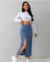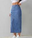 Trendy blue denim midi skirt for women with high waist and button-front design. Stylish and comfortable jean skirt, perfect for casual wear, street style, and everyday fashion.