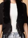 Pure Wool Construction: Made from 100% pure wool, offering excellent warmth and comfort., Luxurious Faux Fur Collar: The faux fur collar adds a sophisticated and elegant touch., Fringe Detailing: Fringe accents along the hemline give the shrug a trendy, bohemian feel., Versatile Design: Can be dressed up or down, making it suitable for both casual and formal occasions., Classic Black Color: A timeless black shade that easily pairs with various outfits.