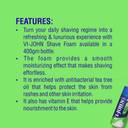 Turn your daily shaving regime into a refreshing & luxurious experience with Vi - John Shave foam available in a 400gm bottle., The foam provides a smooth moisturizing effect that makes shaving effortless., It is enriched with Antibacterial Tea Tree Oil that helps protect the skin from rashes and other skin irritation., It also has Vitamin E that helps provide nourishment to the skin, The foam is suitable for individuals with sensitive skin. It creates a gentle lather that doesn't cause skin irritation.