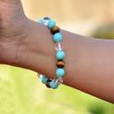 This bracelet is a captivating piece that combines the beauty of clear and turquoise beads with the striking charm of tiger's eye stones. The bracelet features: