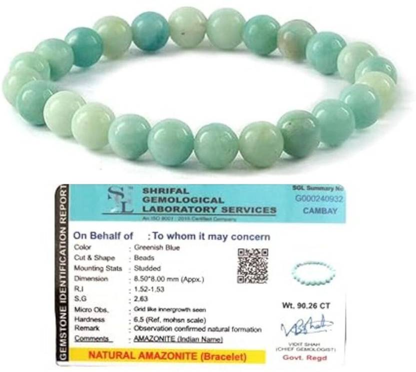 Natural Gemstone - You will receive the similar Natural Beads Amazonite with Gem Testing Lab Certificate 8 mm Crystal Adjustable Bracelet as shown in picture and advertised, since stone is unique kindly do not expect the same piece.