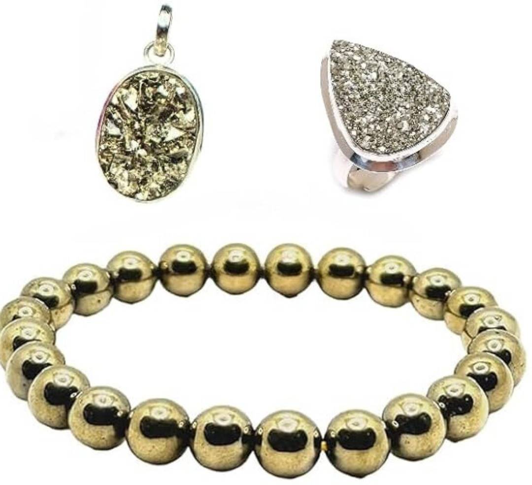 You Will Receive One Pyrite Pendant, Bracelet and Pyrite Adjustable Size Ring.