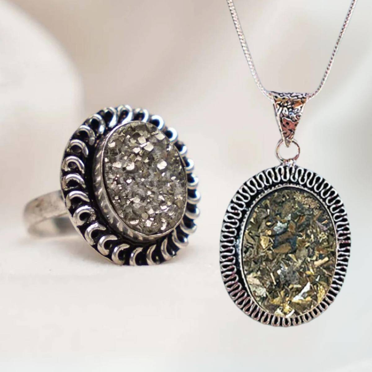 Pyrite Pendant: The Pyrite Pendant complements the ring beautifully with its similar design philosophy. A pyrite gemstone, polished to enhance its innate beauty, is suspended from a delicate chain. The pendant's design could emphasize the intricate details of the pyrite, capturing its metallic glint and the interplay of colors ranging from gold to bronzes and blacks. The pendant can be worn at varying lengths, allowing for versatility in styling.