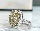 Pyrite Ring: The Pyrite Ring is a finely crafted piece of jewelry that elegantly incorporates a polished pyrite cabochon as its centerpiece. The pyrite stone, with its intricate textures and shimmering golden hues, is securely set within a carefully designed metal ring band. This allows the pyrite's natural brilliance to shine through, creating a visually striking contrast against the metal setting.