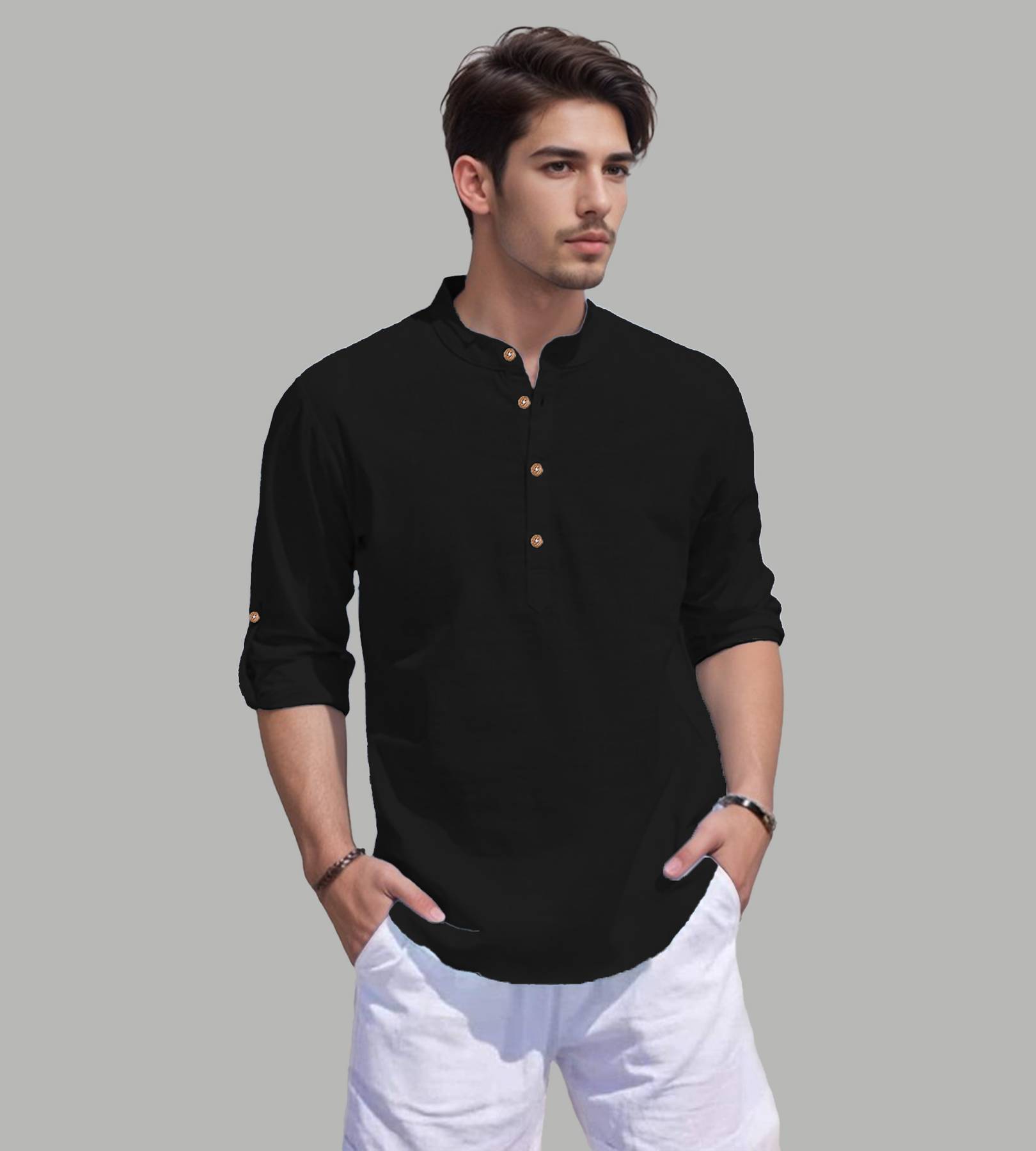 This pure cotton beige short kurta is perfect for men who value style and comfort. Its versatile design makes it ideal for any occasion—festivals, parties, or casual outings. Product Details ?? ????? Gender: Men ?? Pattern: Solid ?? Design Type: Plain ?? Closure: Button ?? Sleeve: Full Sleeve (Roll-Up Option) ?? Waist Rise: Mid-Rise ?? Collar: Mandarin/Chinese ?? Hemline: Curved ?? Fabric: Pure Cotton ?? Product Length: Short ?? Pack of: 1 Material & Care ?? Fabric: 100% Cotton Wash: Suitable for hand wash and machine wash. How to Style ?? Pair it with dark-wash denim or linen trousers for a casual look. Dress it up with a pair of churidar or slim-fit pants for festive occasions. Add leather sandals or loafers and a wristwatch for a classy finish. Roll up the sleeves for a relaxed vibe during daytime events. This short kurta seamlessly blends traditional elegance with modern styling, making it a wardrobe essential for every man! ??